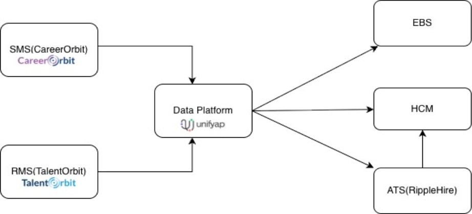 SMS (CO - CareerOrbit) And RMS (TO - TalentOrbit) are integrated directly with Data Platform (DP). Any IB/OB request is processed via DP. DP has flows integrated with downstream systems on Mphasis side i.e., EBS (Project Data, Bill Rate Data and Allocation Data), HCM (HRMS Data) and their Ripple Hire (RH – ATS system)